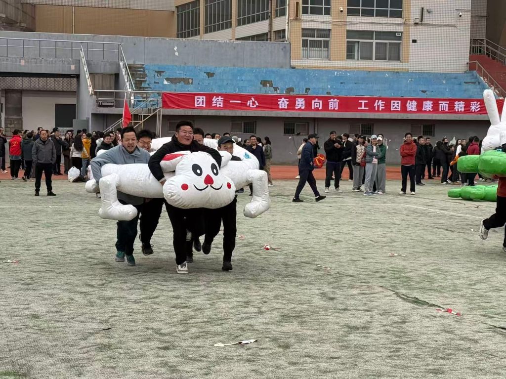 运动场上,“奋勇向前”、“马甲跑得快”、“龟兔赛跑”、“万众一心”、“齐头并进”等十个趣味项目依次展开。在备受关注的“万众一心”协作项目中,随着裁判一声令下,8位教师队员组成的整齐人链,依次侧身穿过呼啦圈,每个人都调整着脚步和身姿,既保持着队伍的连贯,又加快着前进的速度,呼啦圈在他们身间灵活传递,没有一丝卡顿,现场观众的加油声此起彼伏。在考验团队同步的“齐头并进”项目中,经过赛前的交流战术和多次练习,队员们手挽手、步同频,始终保持默契,最终以稳健协同的步伐冲过终点线,赢得现场观众阵阵掌声。最后的混合接力赛上,教师们交接棒精准流畅,如同执行严谨的程序指令,将比赛推向高潮。