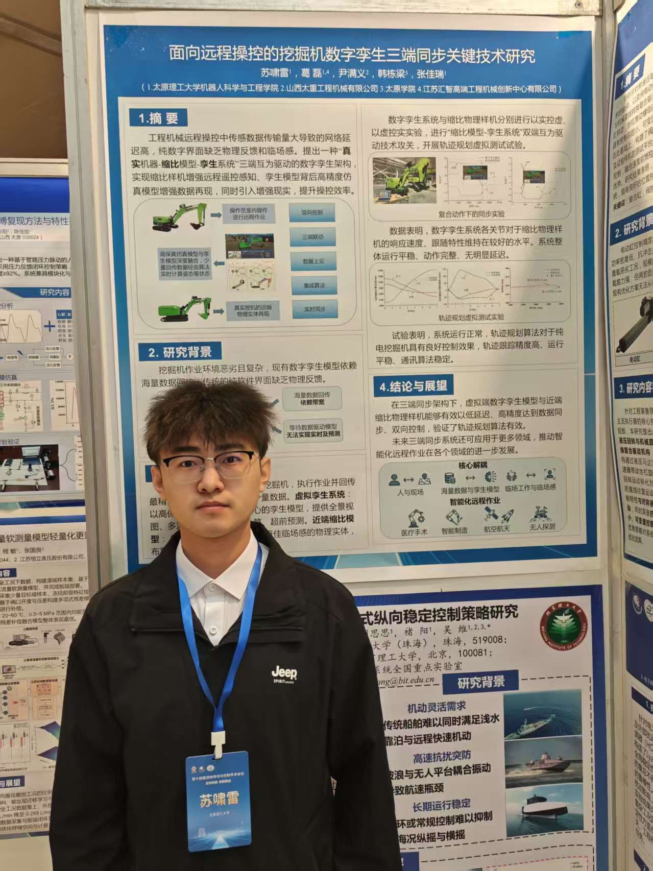 硕士生苏啸雷以《面向远程操控的挖掘机数字孪生三端同步关键技术研究》为题进行海报展示,分享了团队在装备智能化领域的最新进展。