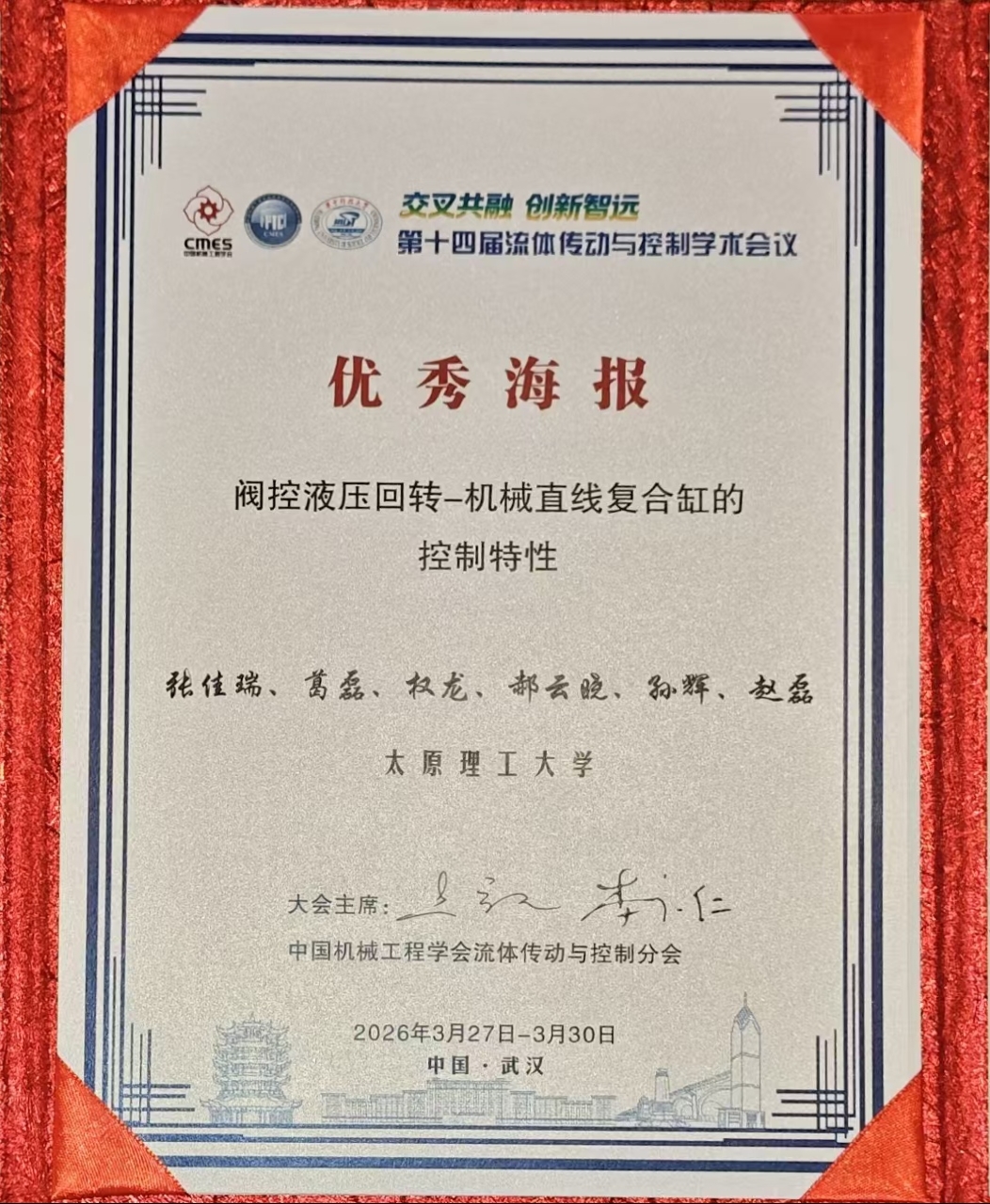 经过会议学术委员会的严格评审,团队师生在众多参会成果中脱颖而出:张佳瑞荣获 “优秀海报奖”荣誉,充分体现了团队在流体传动与控制领域的扎实研究功底和创新能力,也获得了国内外同行的广泛认可。