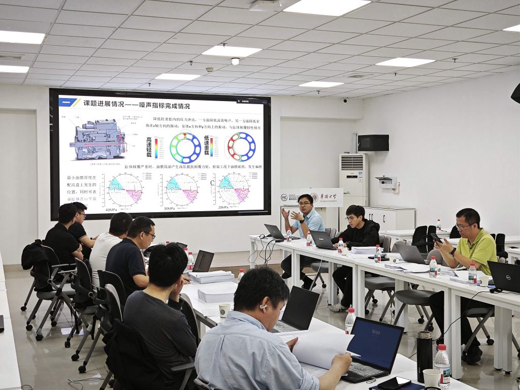 会上,葛磊分享了“宽转速范围重载高速柱塞泵关键技术及样机研制”的最新研究成果。他重点介绍了在宽转速适应性与重载工况下,柱塞泵的设计理论、仿真优化及初步试验进展,并就样机研制过程中遇到的核心技术难点与参会专家进行了深入探讨。会议期间,我团队还同与会单位代表就电静液直驱技术在重载智能机器人领域的应用前景开展了跨学科交流。与会专家认为,高功率密度、高效率的电静液直驱原理,对于提升大型机器人关节及运动机构的负载能力和控制精度具有重要借鉴意义,为机器人技术与工程机械关键驱动部件的融合发展提供了新思路。