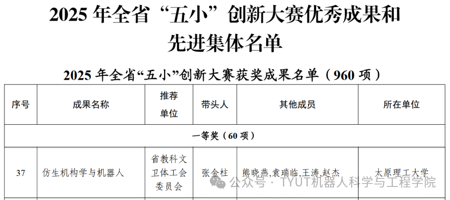 在山西省总工会、共青团山西省委、山西省科学技术协会组织的2025年全省“五小”创新大赛中,机器人科学与工程学院张金柱副教授带头完成的《仿生机构学与机器人》项目获得优秀成果一等奖。