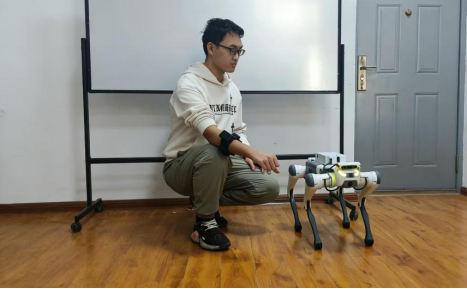 操作人员仅需佩戴肌电手环,通过做出不同幅度和模式的手臂动作,系统便能实时解码其运动意图,并将其转化为精准的控制指令。通过特定的手臂旋前、旋后或屈曲动作,可流畅地控制机械臂末端执行器在三维空间中的移动与抓取操作;同时,通过预设的不同手势模式,能够远程指挥四足机械狗完成前进、后退、左右转向等稳定步态行走。此外,实验人员还可佩戴脑帽,通过采集脑电信号,控制机械臂实现空间运动。